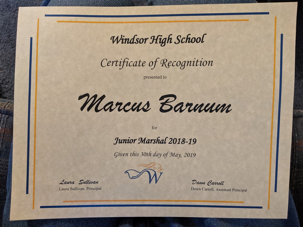Marcus Junior Marshal certificate